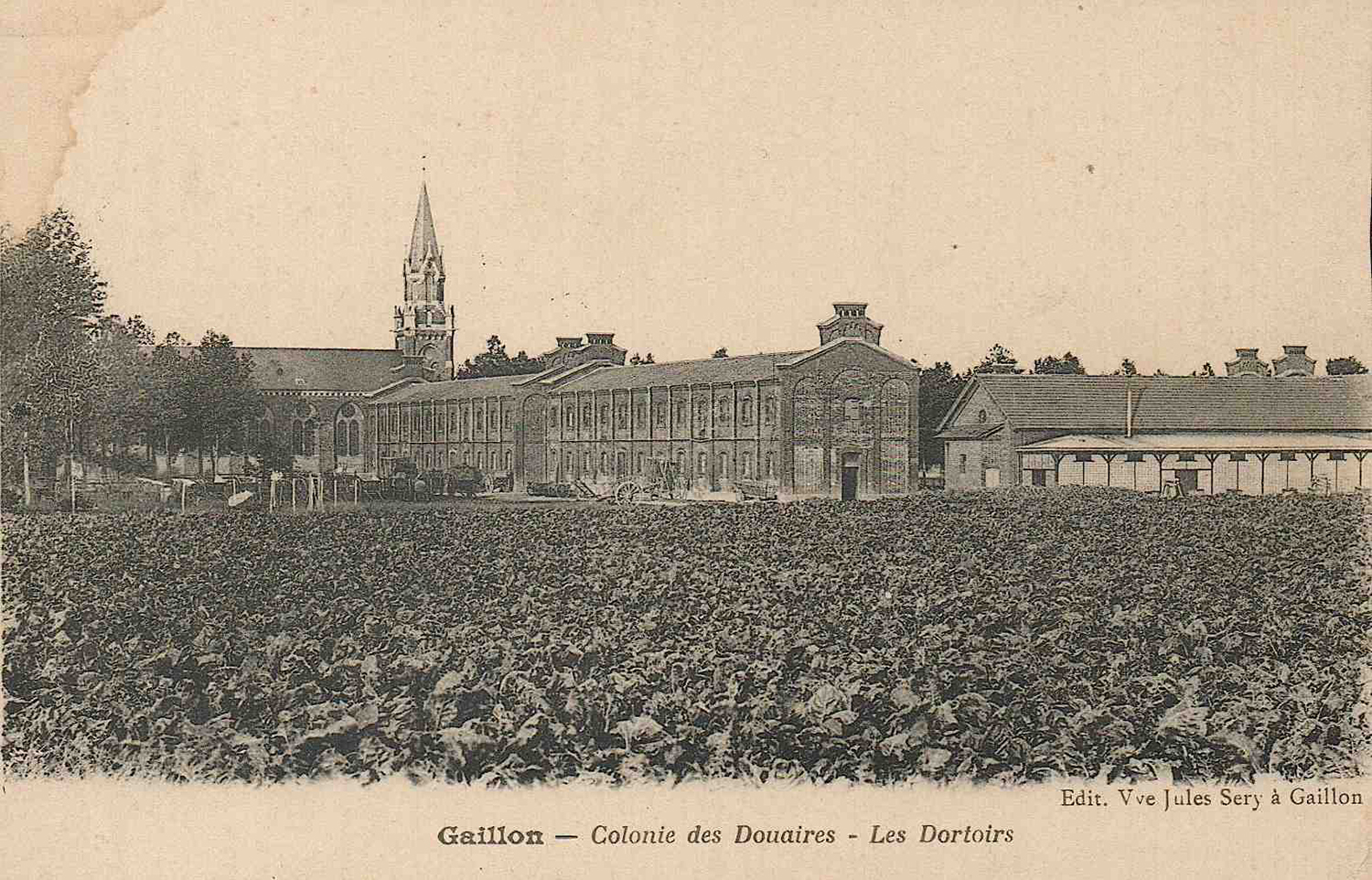 La colonie publique des Douaires fut d’abord une excroissance de la maison centrale de Gaillon, puisqu’une ferme, aménagée en 1862, précéda la construction des bâtiments inaugurés le 25 septembre 1868. La loi de 1850 avait favorisé le développement d’établissements privés, notamment les Bons Pasteurs pour jeunes filles. L’Administration pénitentiaire décida au milieu du Second Empire de se doter de colonies publiques. C’était la première fois qu’on construisait en France un aussi vaste ensemble architectural destiné aux mineurs de justice. Situés au milieu d’un domaine de deux cents hectares, quatre vastes bâtiments à un étage ; de 100 mètres de long et de 10 mètres de large étaient disposés sur deux lignes parallèles, distantes de 60 mètres, de part et d’autre d’une allée centrale qui menait de l’entrée de la colonie à la chapelle, imposante construction prévue pour 600 colons. A l’extrémité de ces bâtiments de briques rouges, ateliers et préaux couverts, bâtiments agricoles étaient disposés perpendiculairement et fermaient un vaste quadrilatère à usage de cours de récréation. Derrière la chapelle imposante, devenu silo à grains depuis, on aménagea un quartier cellulaire, aujourd’hui disparu. Sur le devant, le long d’une large avenue plantée, huit vastes pavillons étaient construits pour l’administration supérieure de la colonie.