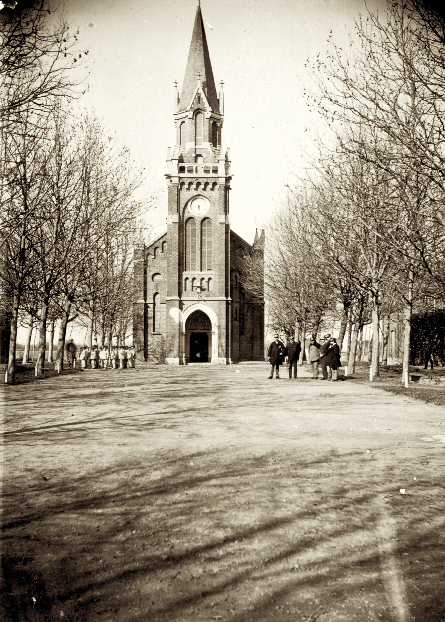 Un groupe de colons de retour des travaux des champs. Les grilles et le porche d’entrée de l’établissement ont aujourd’hui disparu. L’allée centrale plantée, avec de part et d’autre, huit logements de l’encadrement, conduit à la chapelle qui, comme à Mettray près de Tours, occupe une position centrale.