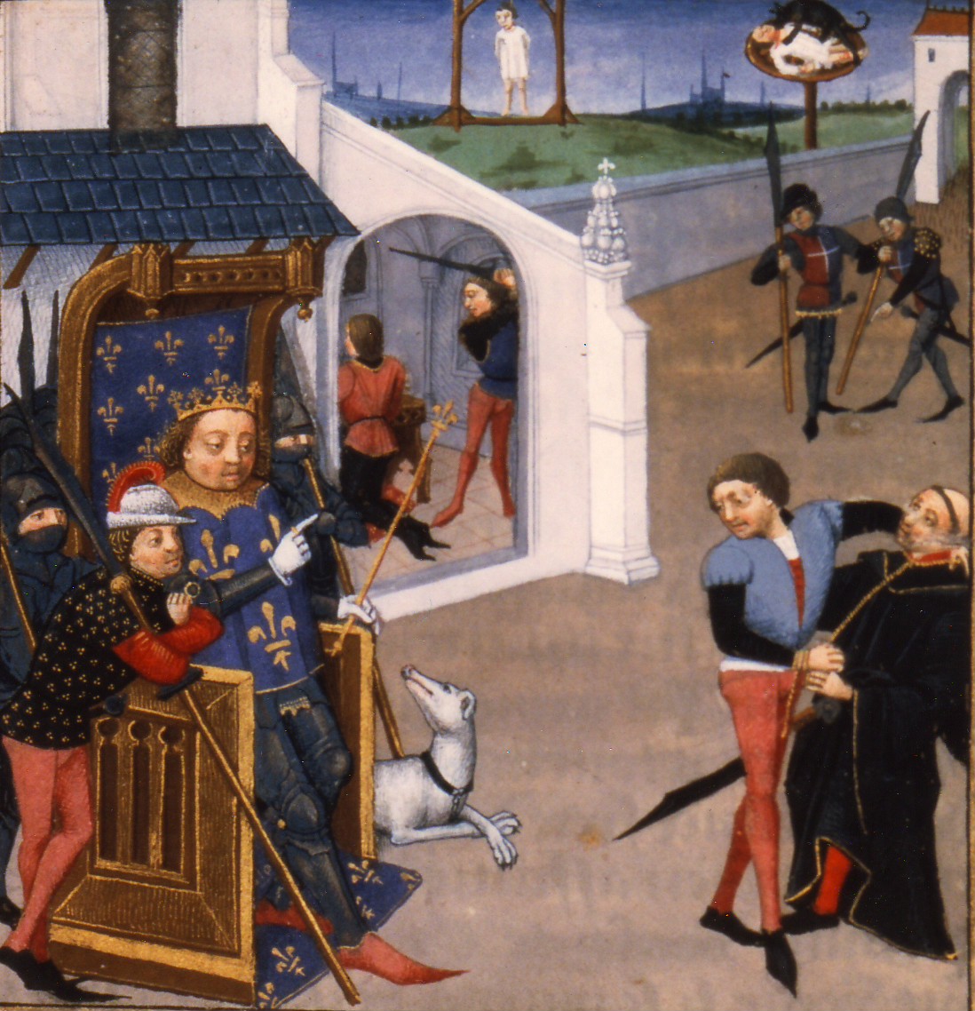 Le comte de Flandre Charles le Bon, fidèle vassal du roi de France Louis VI le Gros, fut assassiné le 2 mars 1127 alors qu’il priait dans à l’église Saint-Donatien de Bruges. La crise politique et la répression qui s’ensuivit marquèrent les mémoires. Cette miniature tirée d’un magnifique exemplaire des Grandes Chroniques de France oppose d’un côté le roi Louis le Gros, et de l’autre les assassins Bouchard et Bertold, meneurs de l’assaut contre le comte : l’un est pendu, l’autre rompu et exposé sur la roue. Au centre de l’image, l’assassinat de Charles le Bon.